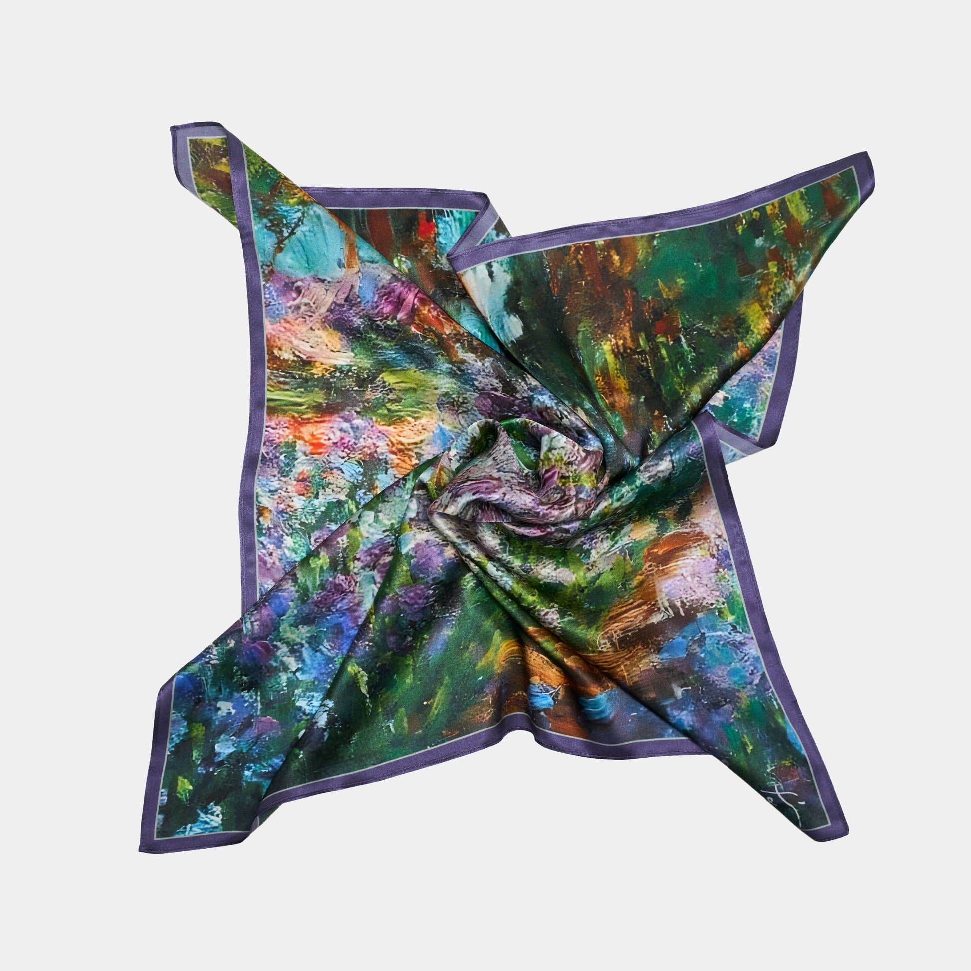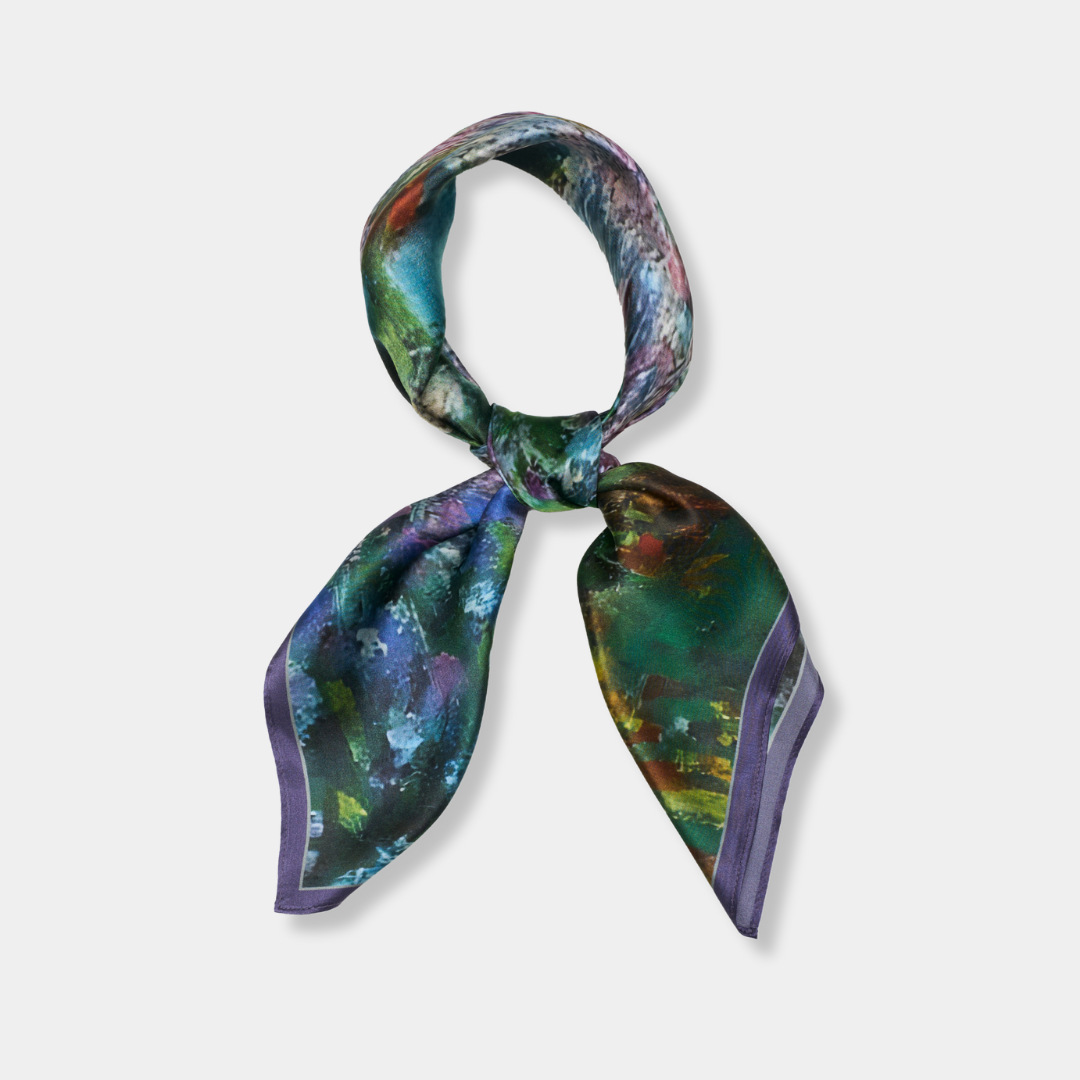 Jedwabna apaszka zainspirowana obrazem „Ogród artysty w Giverny" autorstwa Claude’a Moneta. Olej na płótnie, Francja, 1900 r.