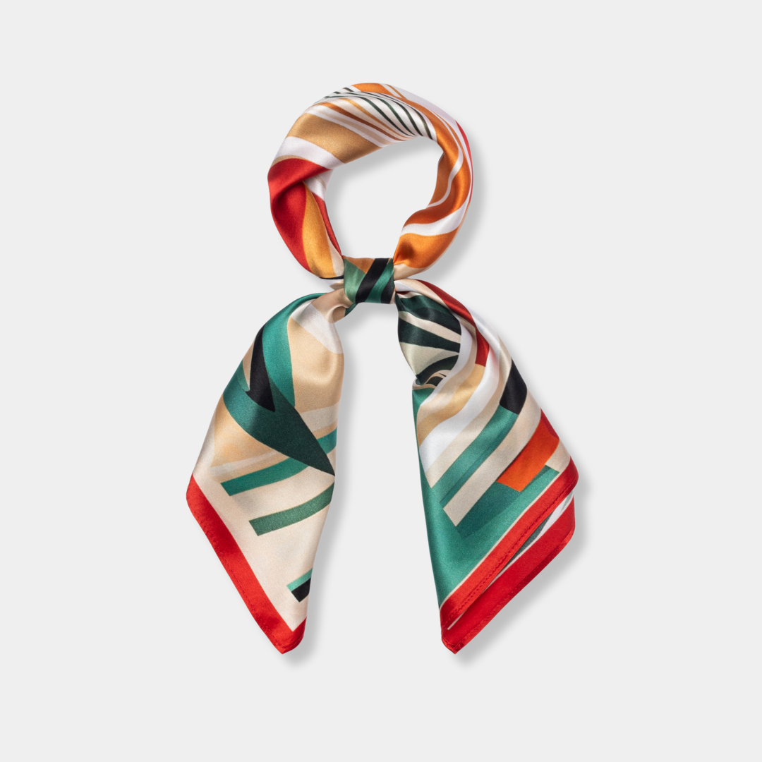 Apaszka doskonale sprawdza się w różnych stylizacjach – można ją zawiązać na szyi, nosić jako ozdobę do włosów lub na głowie, dodać do torebki lub elegancko zarzucić na ramiona.