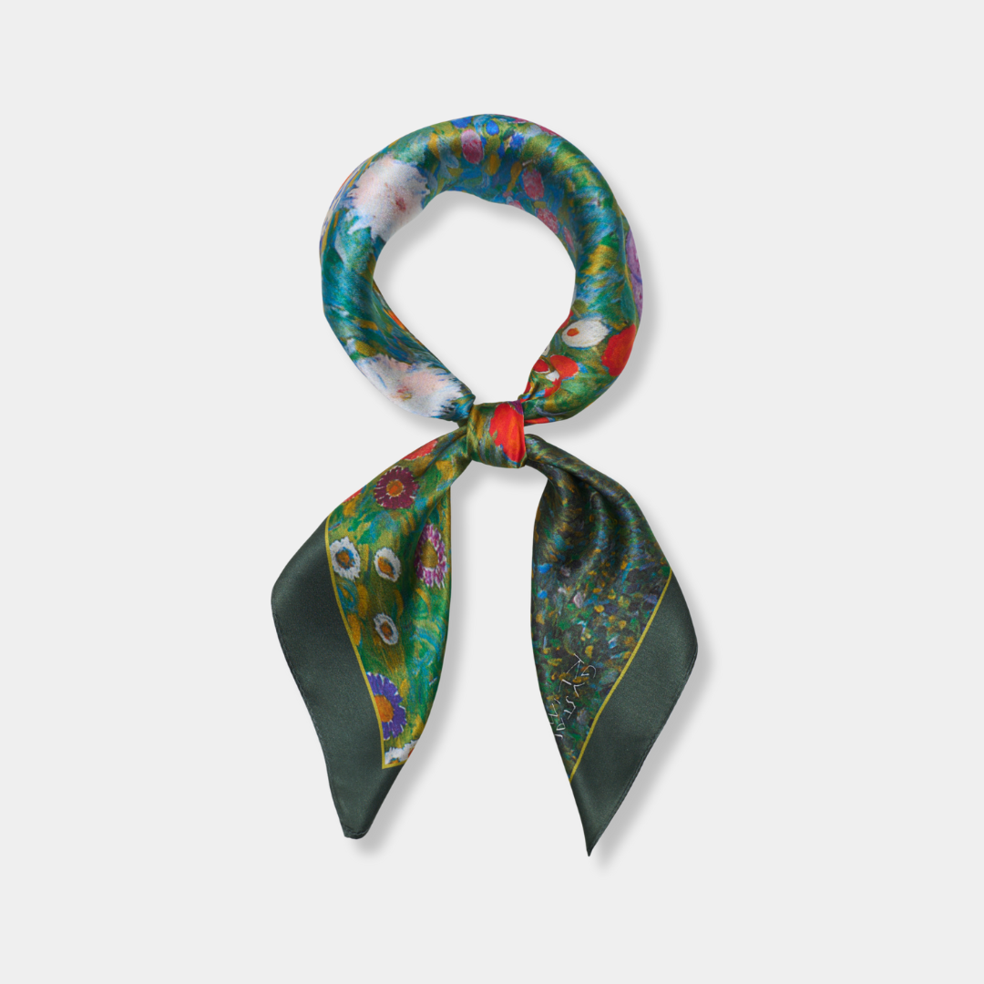 Design jedwabnej apaszki inspirowany obrazem Gustava Klimta „Ogród Przydomowy”. Olej na płótnie, Austria, 1911 r.