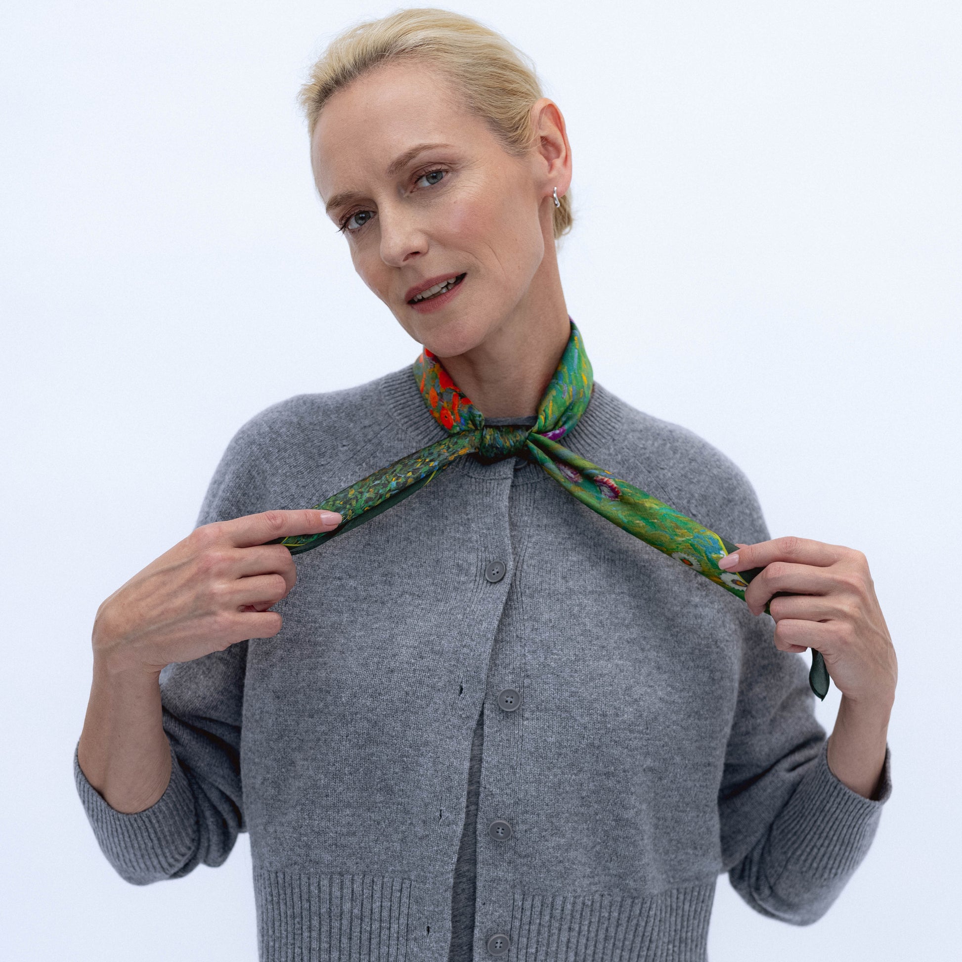 Apaszka doskonale sprawdza się w różnych stylizacjach – można ją zawiązać na szyi, nosić jako ozdobę do włosów lub na głowie, dodać do torebki lub elegancko zarzucić na ramiona.