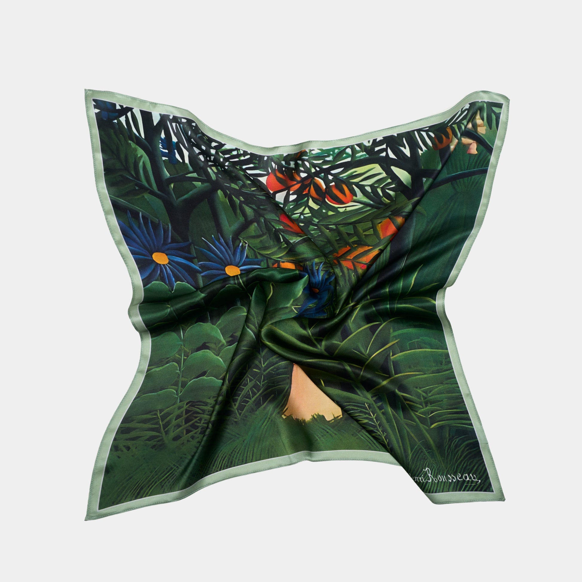Jedwabna apaszka z dziełem Henriego Rousseau to elegancki i luksusowy akcent Twojego stylu. Wyglądaj olśniewająco!