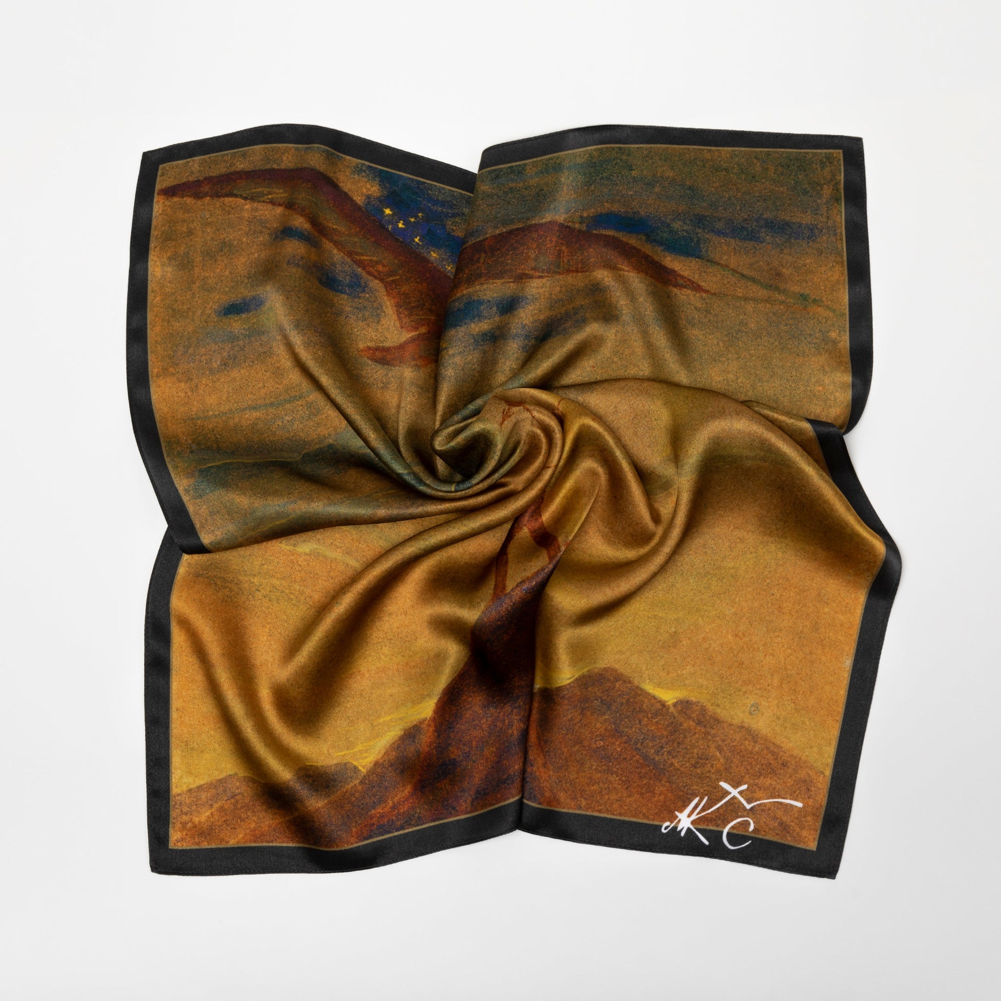 Projekt jedwabnej apaszki „Słońce przechodzi przez znak Strzelca” inspirowany jest jednym z najsłynniejszych obrazów M.K. Čiurlionisa. Połączenie jedwabiu i dzieła sztuki odzwierciedla cechy znaku Zodiaku Strzelec: optymizm, niezależność i pragnienie przygód.