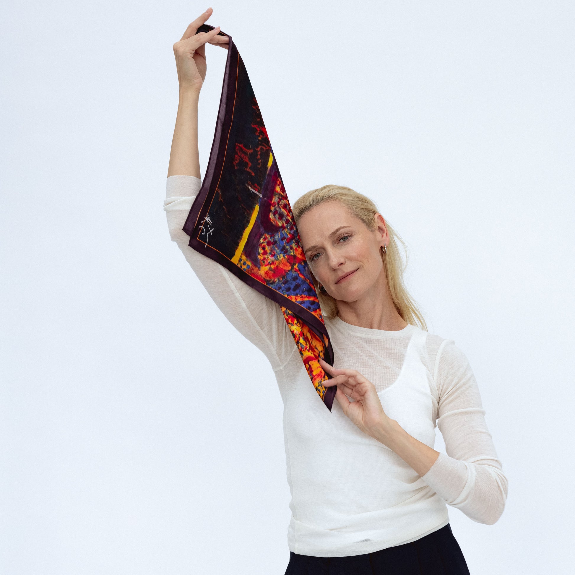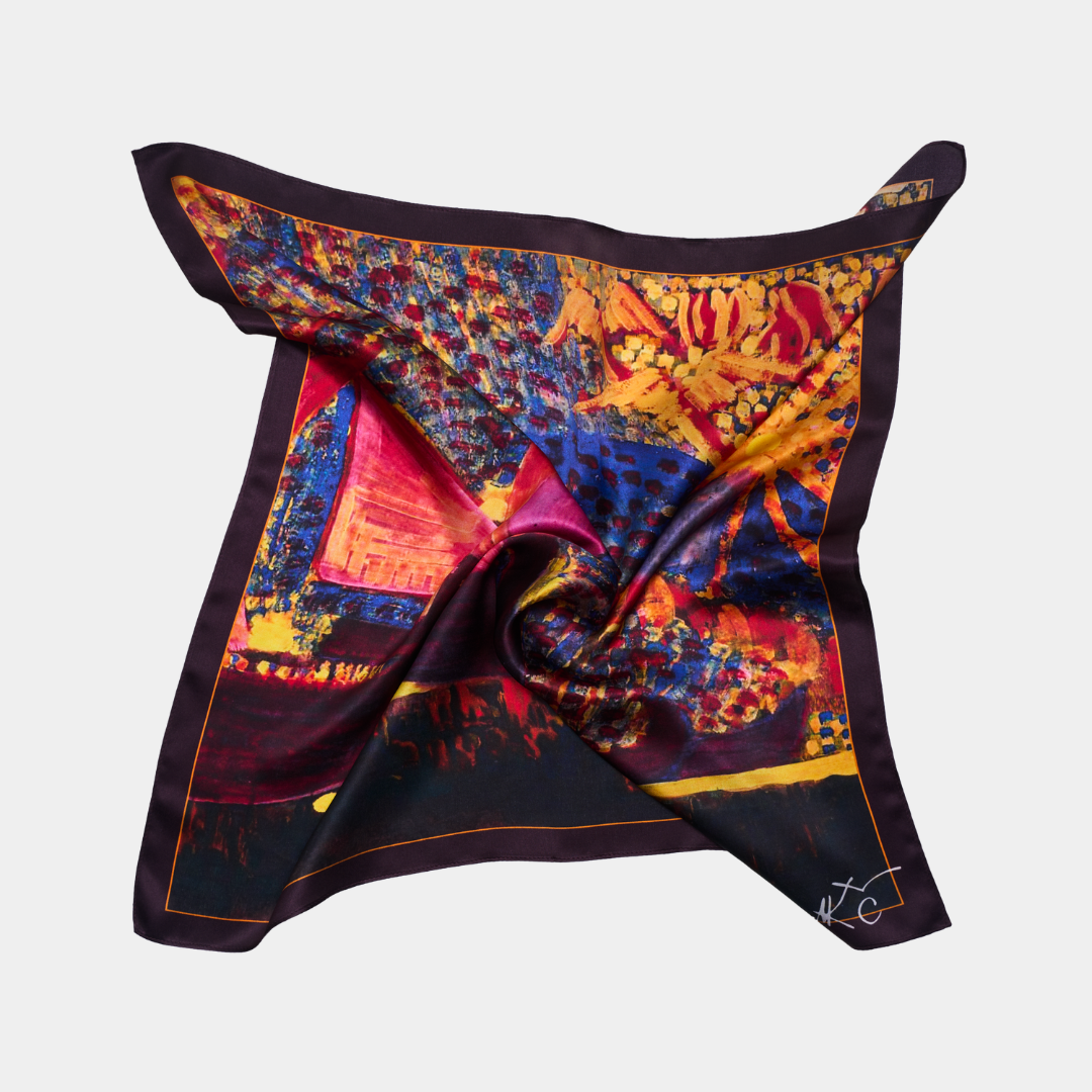 M. K. Čiurlionis to jeden z najsłynniejszych litewskich symbolistów, którego twórczość inspirowana jest muzyką, naturą i głębokimi ideami filozoficznymi. Jego obrazy, pełne mistycyzmu i subtelnej estetyki, ożywają w tej luksusowej jedwabnej apaszce.