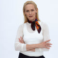 Apaszka doskonale sprawdza się w różnych stylizacjach – można ją zawiązać na szyi, nosić jako ozdobę do włosów lub na głowie, dodać do torebki lub elegancko zarzucić na ramiona.