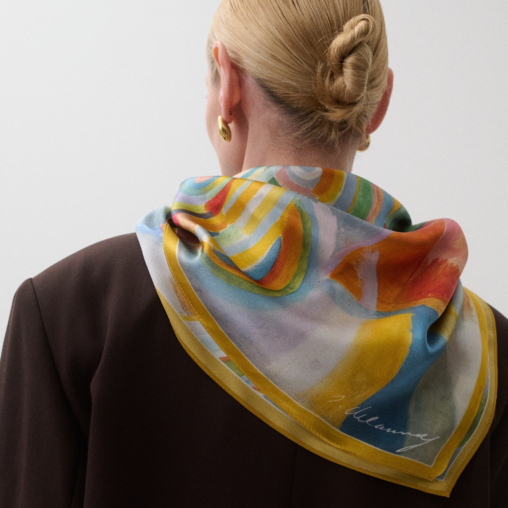 Jedwabna apaszka z dziełem Roberta Delaunay to elegancki i luksusowy akcent Twojego stylu. Wyglądaj olśniewająco!
